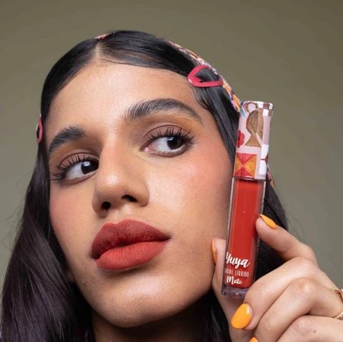 Nuestro labial mate Aura en su tono rojo intenso es ese toque atrevido y apapachador que transforma tu look del día con solo una pasada.